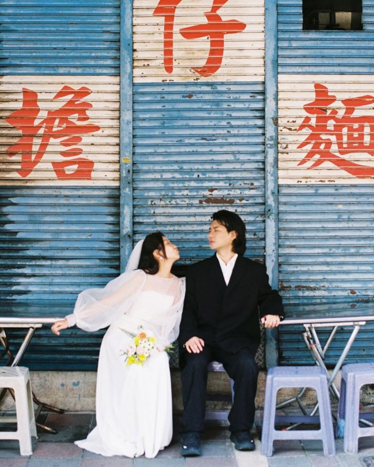 除了民生社區的絕美街景,壹加壹也巧妙結合了路邊小吃攤的懷舊風格,來到位於民生社區的瘦哥擔仔麵店,兩人穿著禮服手拿捧花,輕鬆坐在鐵製桌子和塑膠椅上,背後的鐵皮招牌寫著大大的「擔仔麵」三個字,攝影師運用藍色、白色及紅色的跳色對比和活潑字體排列,讓視覺畫面看起來豐富生動又俏皮,搭配兩人逗趣打鬧的互動,寫實捕捉兩人輕鬆甜蜜的日常。