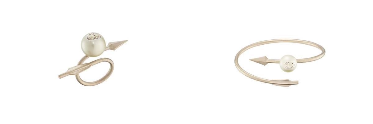 配件,不僅是穿搭的點睛之筆,更是Dior美學的重要延伸。從包款、鞋履到飾品,每一處細節都凝聚著品牌的精湛工藝與設計巧思。例如弓箭造型的手環與戒指,在舉手投足間流露無限魅力,展現迪奧女孩優雅且率性的一面。尖頭黑色高跟鞋則以金色品牌字樣點綴於黑色皮革之上,為造型增添一抹低調奢華的質感。