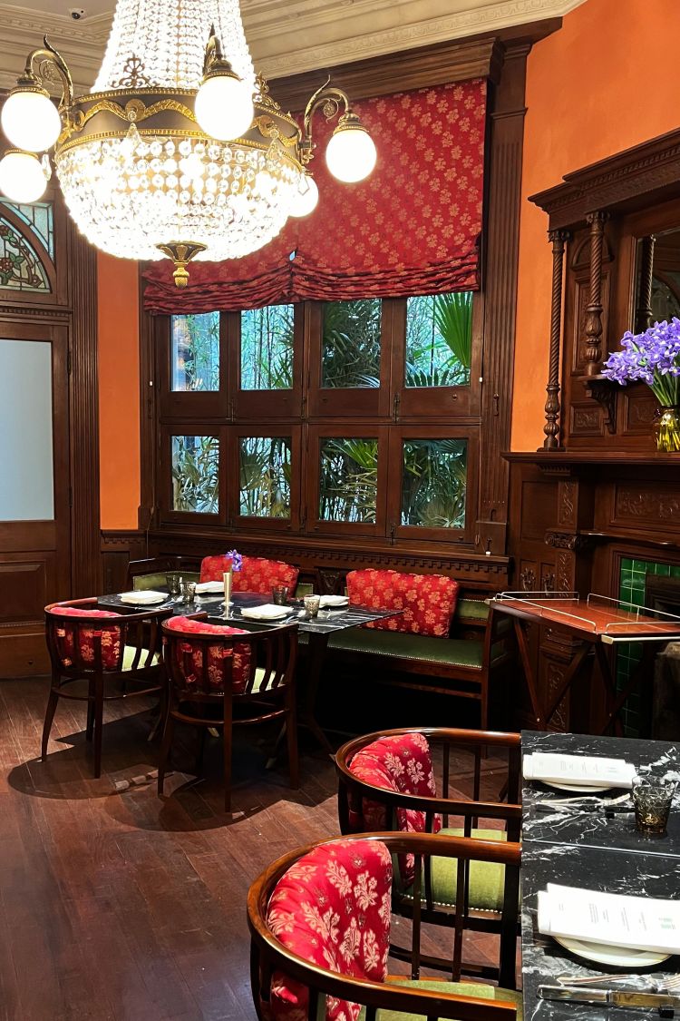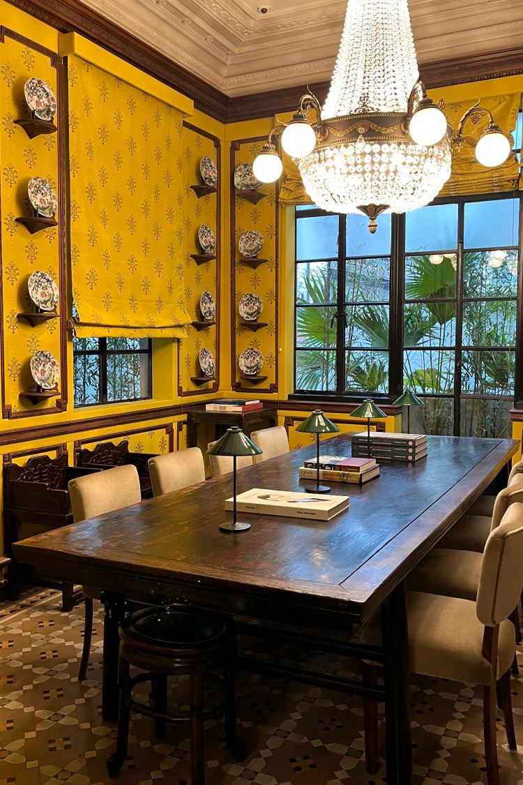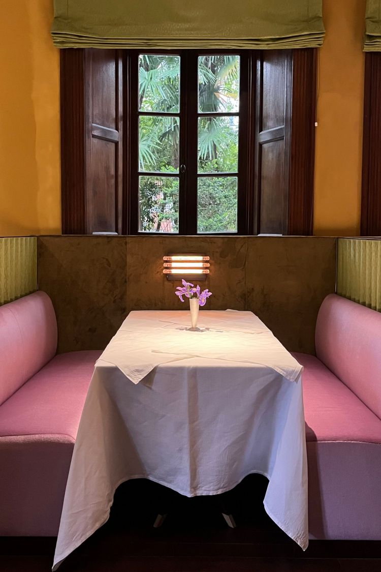 在空間設計上,Prada 榮宅嘗試轉譯王家衛導演筆下的經典場景,從《花樣年華》的餐桌燈飾,到《繁華》的朵雲軒木板水印,融入濃厚的東方色彩。冰透潔淨的三條壁燈、對稱的淺紫柔軟沙發,更加襯托大理石紋桌面上的藍紫鳶尾花卉芬芳。隨著用餐的時光緩緩推進,西斜夕陽親吻著樹葉的婆娑之光,從經典的木格窗引入室內每一隅。