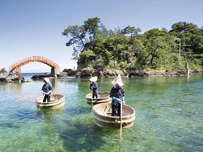 如今,遊客可在小木海岸親身體驗小木盆舟,乘著圓桶舟緩緩划行於碧綠透明的靜謐海灣,一邊欣賞海面漂浮的兩座小島,一邊感受穿越時空的漁民文化。這片海域水質清澈,能清楚望見海底景色,紅色的太鼓橋橫跨島嶼,更為風景增添詩意。