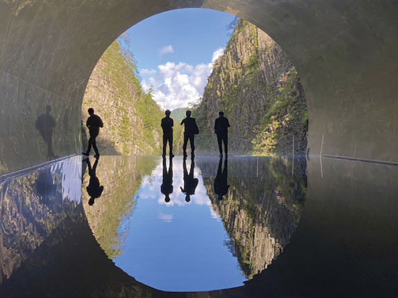 位於新潟縣十日町市的清津峽,與富山縣的黑部峽谷、三重縣的大杉谷並列為「日本三大峽谷」。雄偉壯麗的峽谷沿著清津川兩側聳立,被指定為國家名勝及天然紀念物。清津峽的誕生可追溯至1500萬年前,由於火山活動導致火山灰堆積,形成凝灰岩地層。隨後,岩漿流入與清津川的侵蝕作用,逐漸塑造出如今的壯闊峽谷。 隧道最深處的「全景觀景台(パノラマステーション)」是一大亮點,腳下鋪設的水面如鏡,映照出隧道框架內的峽谷美景,營造出神秘而夢幻的視覺效果。無論是春天的新綠、夏日的濃翠、秋季的紅葉,還是冬天的皚皚白雪,這處全景觀景台都能呈現出四季變幻的迷人風貌,因此也成為熱門的攝影勝地。
