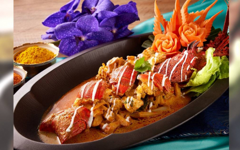 另外還有經典必嘗的「椰汁水姑娘龍蝦乾咖哩」,是以清邁特色乾咖哩為啟發,以辛香濃郁的紅咖哩為基底,加入香濃椰奶與肥美的澳洲水姑娘龍蝦,讓順滑醬汁緊緊包覆蝦身;另一款海鮮料理則推薦「泰式酸辣大沙公」,融合泰式冬蔭(Tom Yum)的酸辣風味與辣炒螃蟹,主廚結合香茅、檸檬葉、辣椒與青檸汁,將1公斤以上的肥美沙公入鍋爆炒,酸辣滋味緊覆於蟹肉上,創意演繹傳統冬蔭風味。