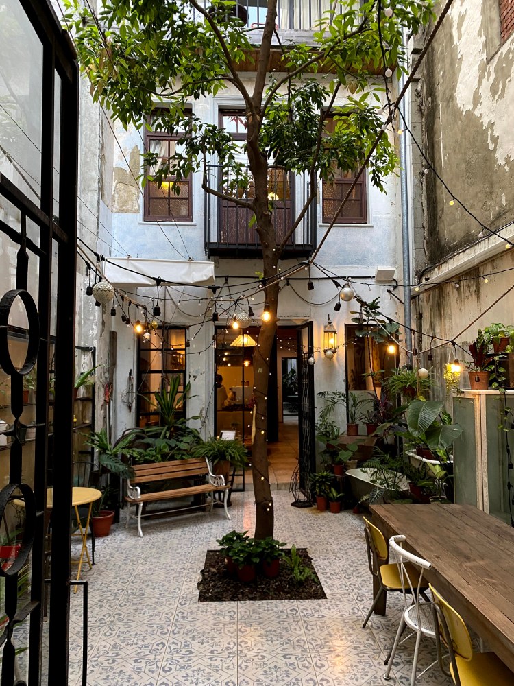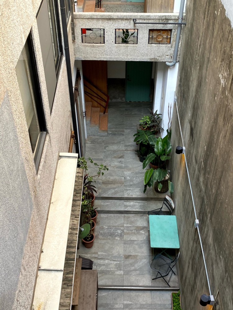 而位於建築中段的綠意中庭,更以大量植栽,各式木椅、花磚妝點,陽光灑落,有種身在異地的錯覺,像是台南街巷裡,藏了一座歐式庭院。
