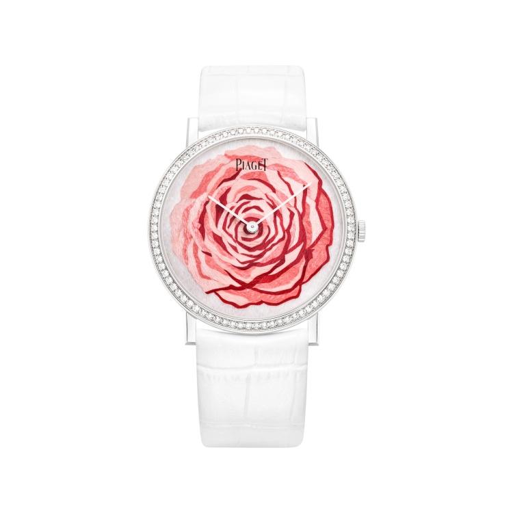Piaget 將浪漫也壓縮成了極致纖薄。這款 Altiplano Rose 不僅是致敬品牌經典與創辦人鍾愛的玫瑰,更在 7.02mm 厚度中容納了藝術與工藝的雙重境界。錶盤以木質細工拼嵌出80片花瓣構成的玫瑰圖騰,搭載 430P 超薄機芯,將女性柔美化作時間的軌跡。它不僅是一件錶,更是一件配戴在手腕上的微型藝術品。(價格 NTD 2,340,000)