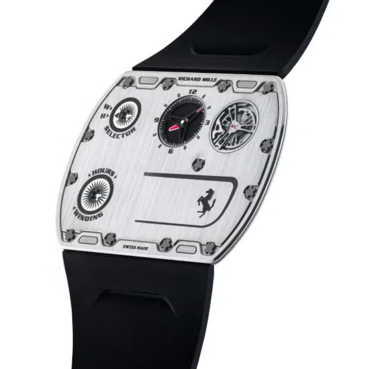 這只 Richard Mille 與 Ferrari 聯名的限量腕錶,與其說它是錶,不如說是來自未來的工藝試煉場。厚度僅 1.75mm 的 RM UP-01 Ferrari,將5級鈦合金打造出如刀刃般的平整度,強悍卻輕如羽。它不只適合展示櫃,更能隨 F1 車手奔馳,證明「美」也能兼具「狠」。極簡水平設計讓人想起義式超跑的流線感,是速度與優雅的極限融合。(價格店洽)