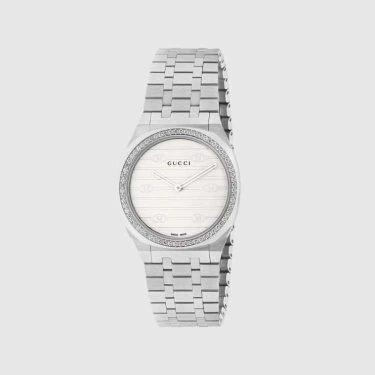 如果你曾迷戀當代建築,那麼 Gucci 25H 就是你的城市心靈投影。這款 7.1mm 的纖薄錶款以多層鋼殼與五鏈錶帶,打造出仿若摩天大樓的線條感,互扣「雙G」標誌點綴其間,是品牌由時尚跨足製錶的一次成功展演。它不只適合伸展台,也適合會議室,能文能武,是現代女性的最佳戰友。(價格約 NTD 143,000)
