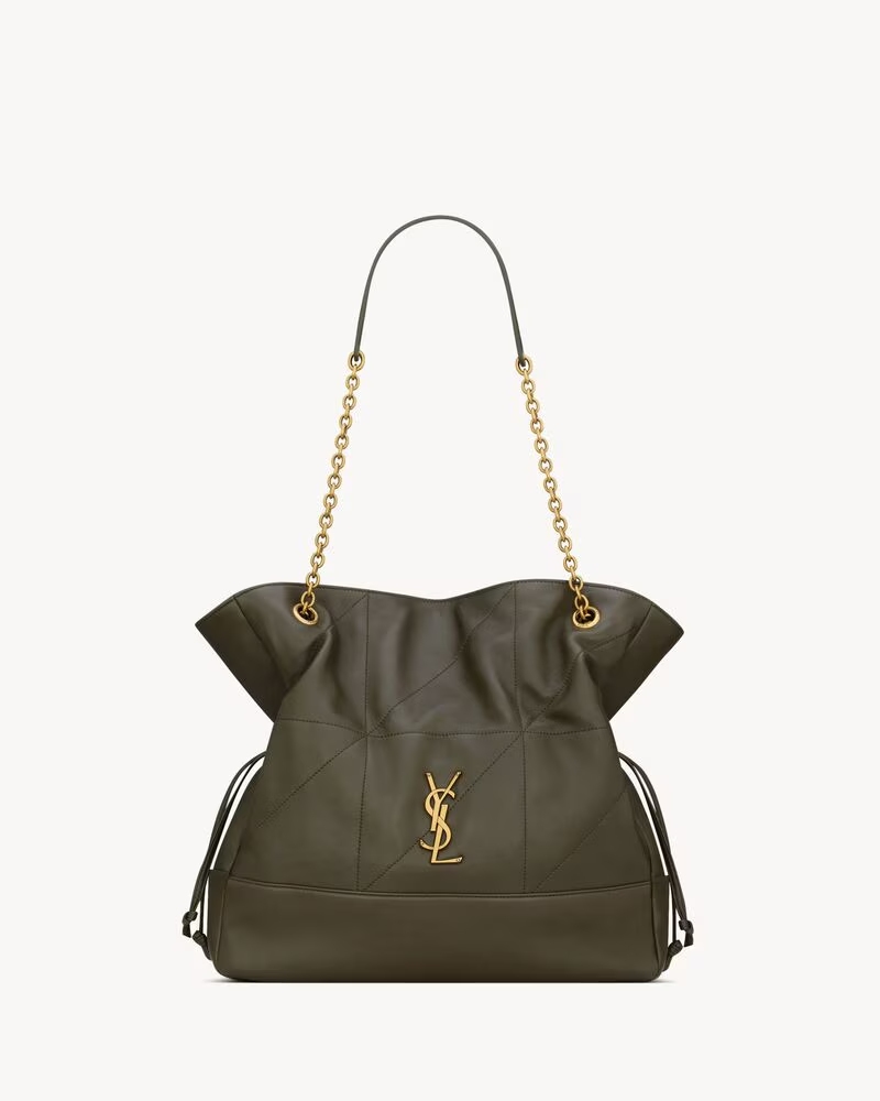 Saint Laurent 自帶的酷女孩氣質,讓品牌的包款擁有一大票擁護者,這款名為「Jamie」的大包運用幾何構成的絎縫線條點綴,並將品牌標誌性的 logo 點綴於包身上,搭配上能自由形塑包身的束口元素,以及金屬鍊帶的運用,讓包袋整體擁有隨性與精緻並存的氣質。(商品售價: NTD107,350)