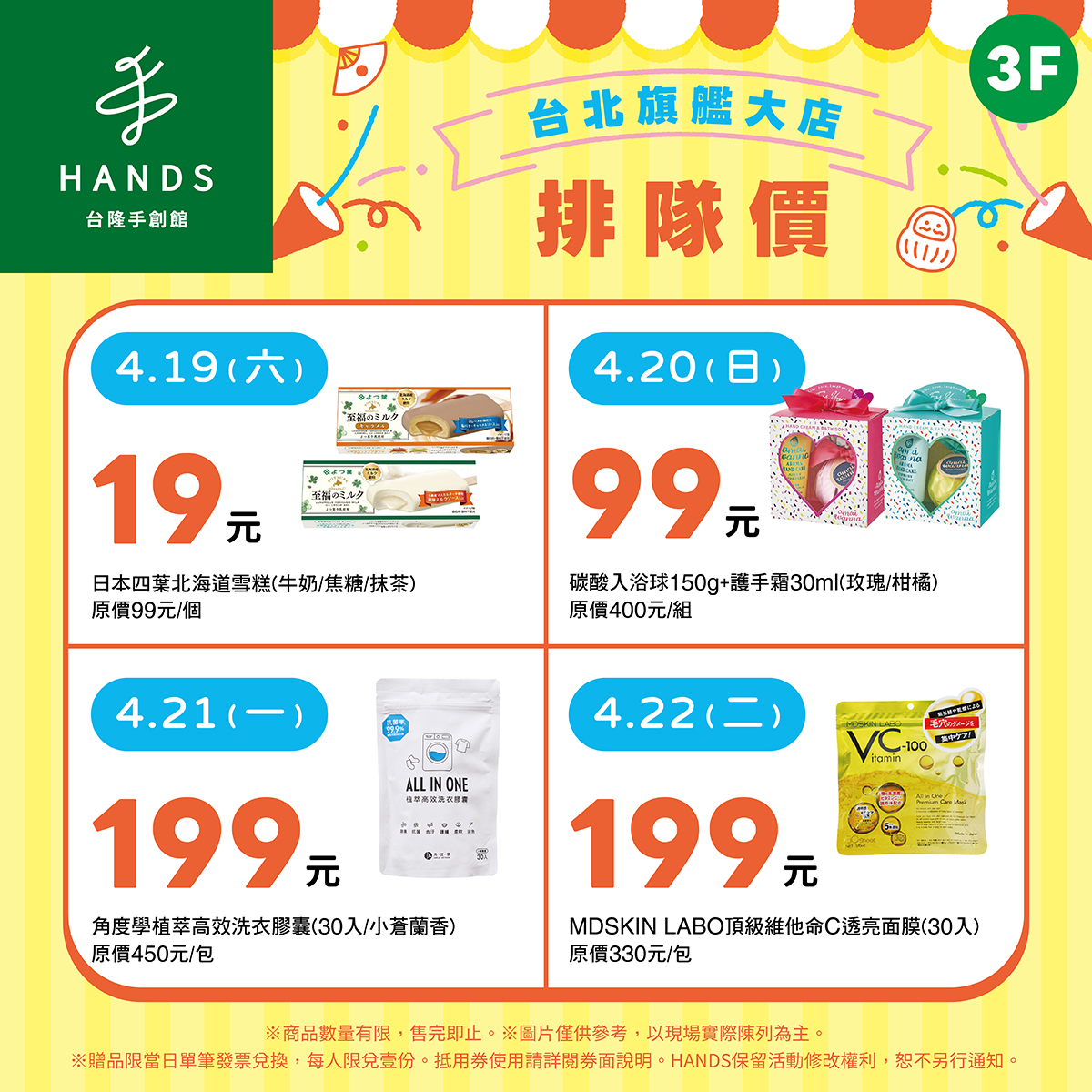 4月19日至5月11日展開台隆手創館南港大店獨家〈開幕慶〉活動,首四日推出限量商品排隊價優惠,4月19日-日本四葉北海道雪糕每支19元(原價99元),4月20日-碳酸入浴球+護手霜禮盒99元(原價400元),4月21日-角度學植萃高效洗衣膠囊30入/小蒼蘭香199元(原價450元),4月22日-MDSKIN LABO頂級維他命C透亮面膜30入199元(原價330元)。