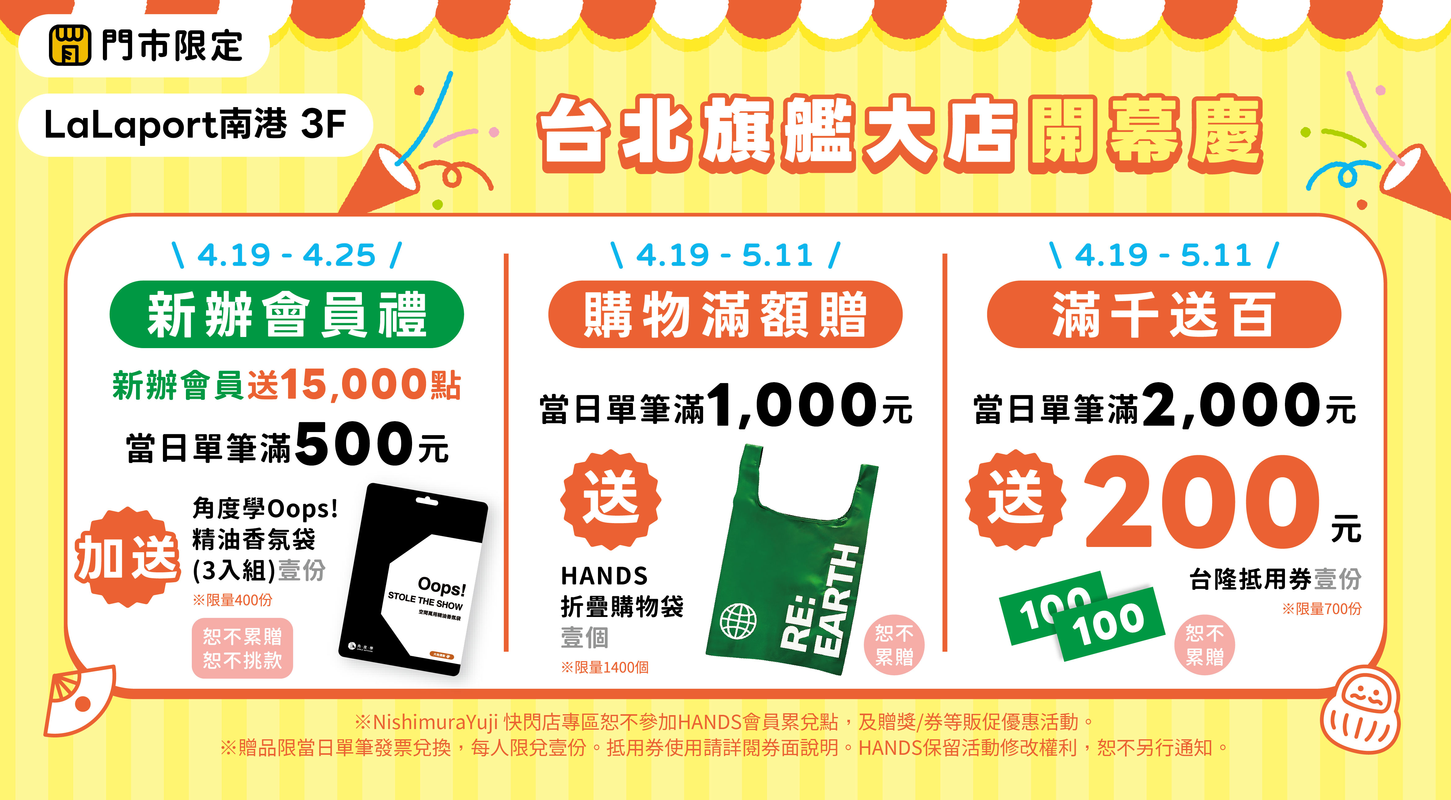 HANDS台隆手創館台北旗艦大店4月19日起,在LaLaport南港店三樓與大家見面,近400坪遊逛空間,35米全台最大寬敞門面。開幕亮點搶先看!全台獨家NishimuraYuji-西村優志-快閃店專區、五大生活專區-想變美/想睡好/想舒壓/想療癒/想旅遊,超過2萬品日系選物一站購足。台隆手創館南港店4月19日至5月11日舉辦〈開幕慶〉活動檔期,新辦會員獨家滿額贈「角度學Oops!精油香氛袋(3入組/市價590元)」;購物滿2千送2百元台隆抵用券,抵用券無使用門檻十足抵用回饋;單筆滿1千元贈送HANDS折疊購物袋,輕巧好收納,清水洗滌即可重複使用。