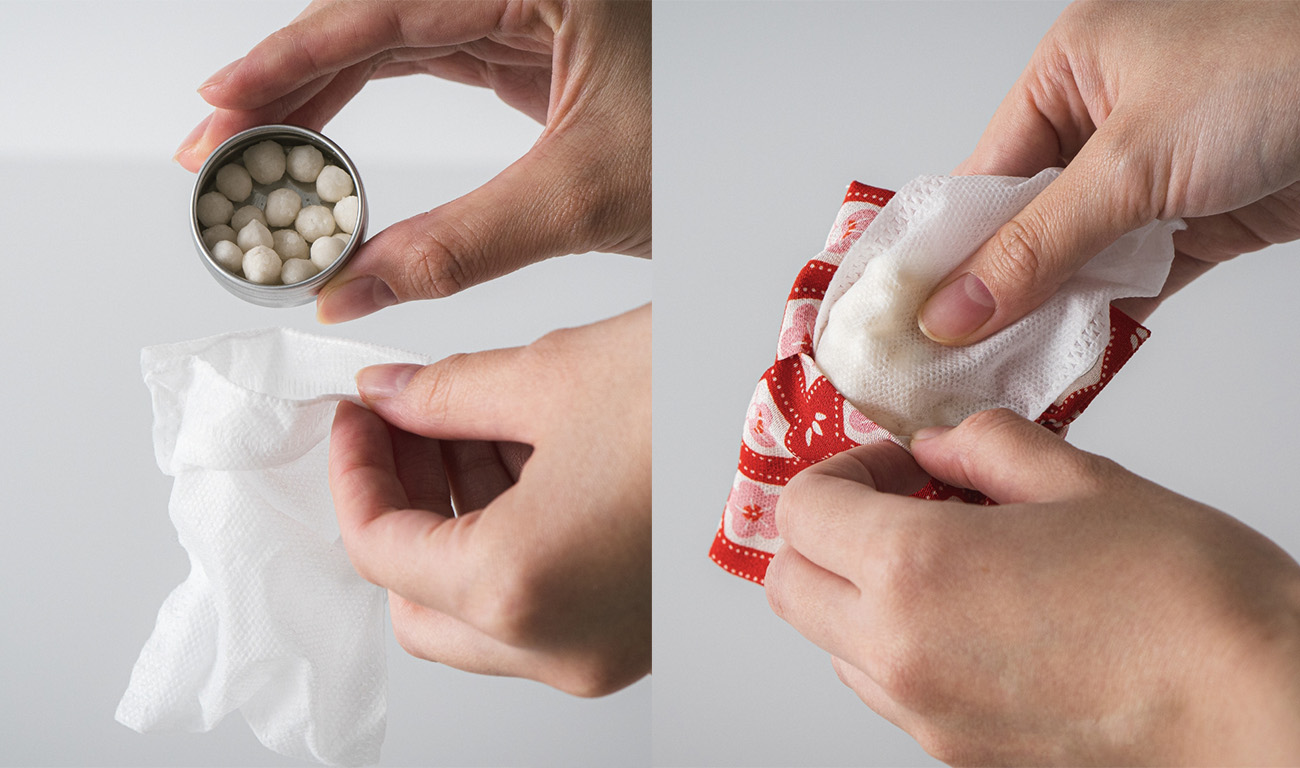 最後就是將香氛罐當中的芳香球倒入內袋,再把內袋塞回外袋當中,繫上掛繩之後就大功告成啦~香味可持續約1~2個月左右,即便香味消失,香氛袋也能作為居家裝飾品繼續掛著。