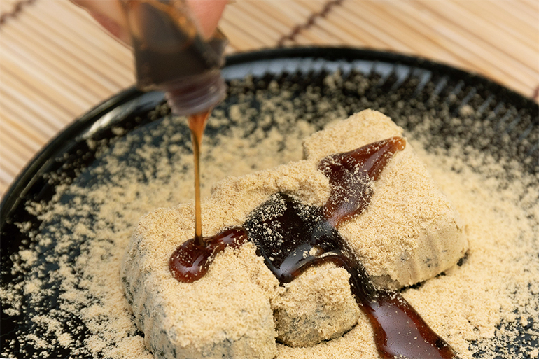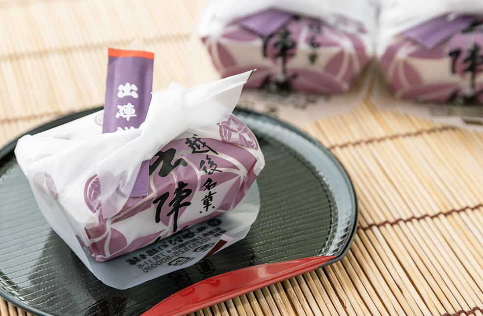 相傳,上越名將上杉謙信在出征前的清晨,會分發麻糬給將士,以鼓舞士氣、增強體力。「出陣餅」 正是以這段歷史為靈感製作而成,選用一口大小艾草麻糬撒上黃豆粉,並搭配黑糖蜜,成為新潟代表性的名菓。 因外觀與山梨知名銘菓信玄餅相似,兩者經常被混淆。信玄餅採用較甜的白色麻糬,而出陣餅則使用艾草麻糬,其獨特的清香與彈嫩口感,讓人一試成主顧。自 1969 年發售以來,深受新潟縣民及各地饕客喜愛。