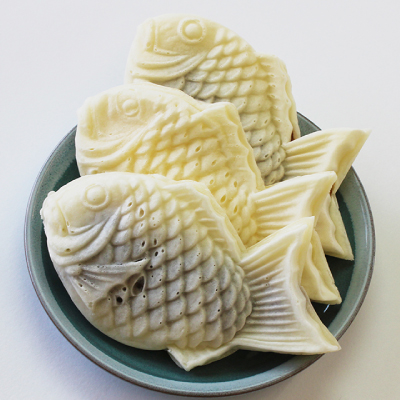 曾在日本知名綜藝節目《松子不知道的世界 (マツコの知らない世界)》被介紹的白鯛魚燒(白い鯛焼き),是使用新潟縣產越光米製成的米粉為主原料,打造出獨特的 「白色外皮」,擁有柔軟又Q彈的口感,內餡包括經典的小倉紅豆、卡士達、巧克力、起司奶油等,不論是冷藏享用還是加熱後品嚐,都能感受到米粉外皮的彈嫩口感。
