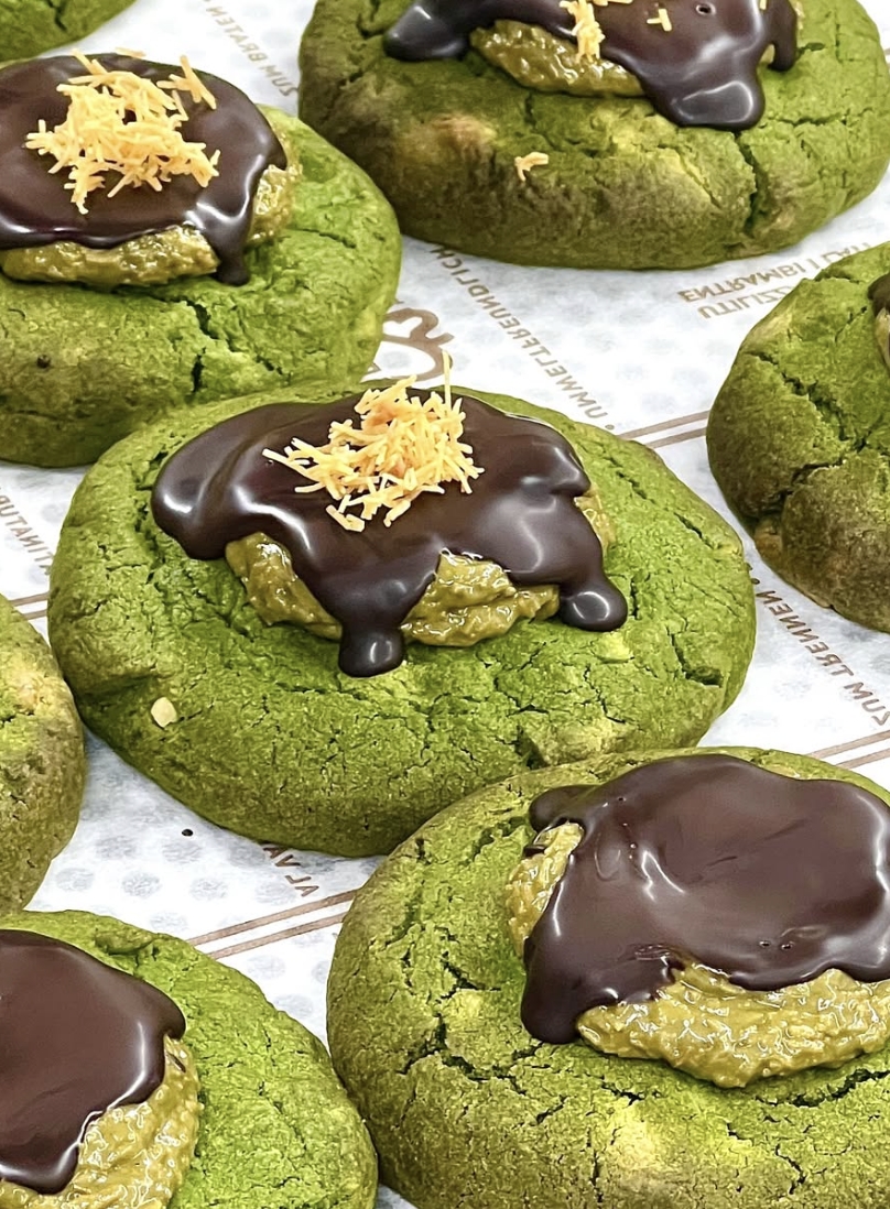 像是這道「杜拜餅乾」(ドバイクッキー),在濃厚的巧克力餅乾上,擠上一整團與杜拜巧克力內餡相同的開心果脆脆內餡,能品嘗到香濃的開心果滋味。