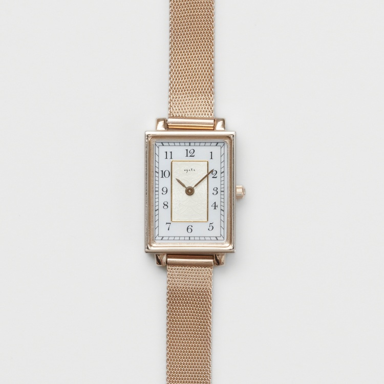 日本品牌 agete 的這款長方型腕錶,介於飾品與手錶之間。米蘭式淡金色錶鍊彷彿流動的金光,搭配書寫體數字時標、白蝶貝錶盤,以及錶盤中央的鵝黃色方框,就好像將一枚陳舊卻富含意義的信封鑲在腕間。值得一提的細節是,腕錶的錶冠上鑲有一顆小鑽,如落在信紙上的淚滴,盡顯浪漫情懷。這枚錶風格溫婉細緻,適合文藝氣質、享受生活的你。(價格 NTD 29,000)
