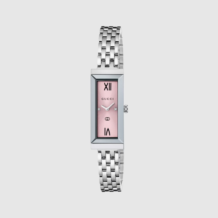 Gucci 總是很懂得用色彩說故事,這只 G-Frame 腕錶,在 14×34mm 的不鏽鋼錶殼中,嵌著宛如糖果紙的粉紅錶盤,在3點與9點鑲上鑽石點綴,12點與6點則以羅馬數字端莊鎮場。雙G標誌如同簽名,細膩中透出自信。這只錶本身就像「古馳女孩」本身,時而甜美、時而搖滾,既有少女情懷,也不失成熟女人的魅力鋒芒,是日常穿搭裡最出其不意的亮點。(價格約 NTD 47,500)