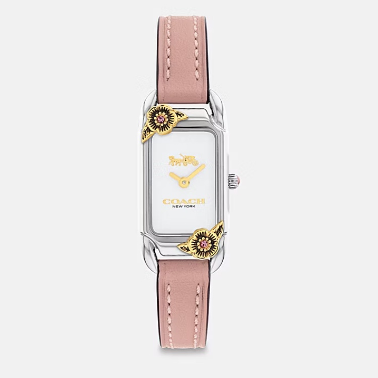 來自 Coach 的這款 Cadie 系列腕錶,像是從復古珠寶盒中翻出的珍寶,將 Art Deco 風格和現代趣味融於一體。乾燥玫瑰粉色皮革錶帶搭配 17.5×28.5mm 的不鏽鋼錶殼,左右對角綴有金色茶香玫瑰與水鑽細節,彷彿晨曦中的花朵閃閃發光。錶盤上的金色馬車標誌與細緻指針相映成趣,是一款有溫度的飾品型腕錶,配戴它,彷彿瞬間走進1920年代的紐約街頭,裙擺搖曳、笑容自信。(價格 NTD 10,800)