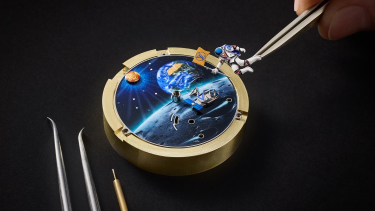 工匠為了畫好地球雲層的陰影、月球的隕石坑、太陽的金光火焰,得來回塗布多層琺瑯色彩,還不能有一滴錯筆。整體設計不僅前衛,更像是一艘穿越時間的星際船艦,準備飛向下個維度。看著它,會讓你懷疑這是不是一部縮小版的《星際效應》,既浪漫又充滿天馬行空的趣味性。