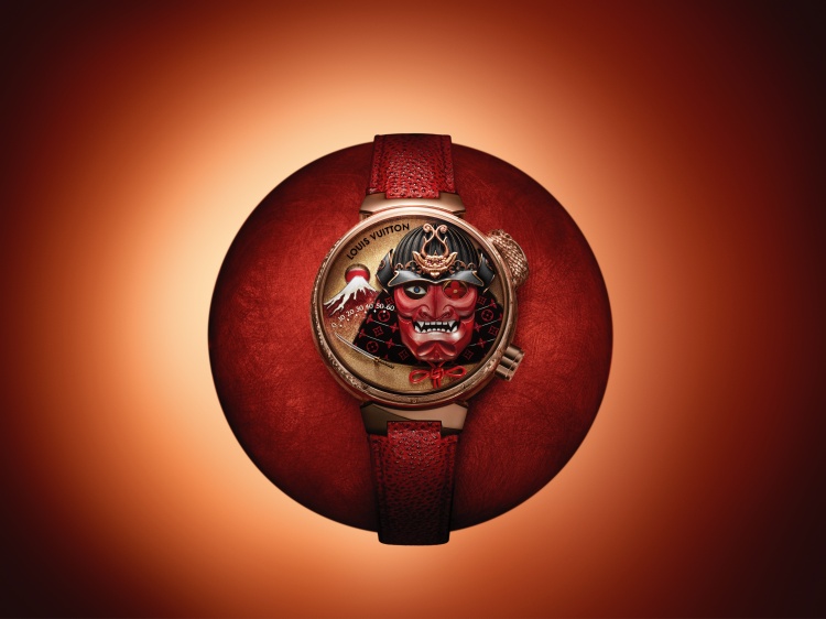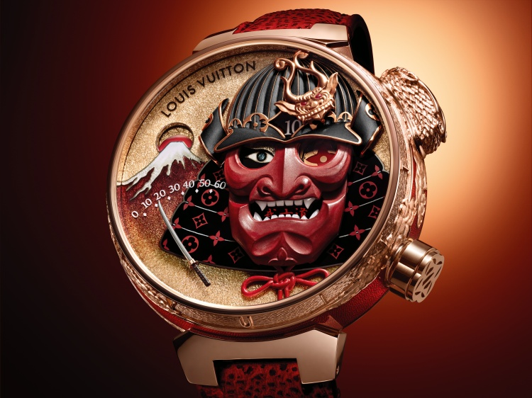 這枚採用 LV 525 機芯的自動人偶腕錶不只會動,還會說故事。LV 把日本歷史裡象徵「榮譽與責任」的武士精神濃縮在短短16秒的動畫裡。「鎧兜」(武士頭盔)揭示跳時數字、武士刀展現逆跳分鐘,搭配雕刻細緻如浮世繪的面具、掐絲琺瑯工藝的富士山,以及閃閃發亮的玫瑰金鑲嵌紅寶石「妖怪」隱藏其中——你看著它,不只是看時間,而是看一個時代如何在金屬與琺瑯中復活。這是錶嗎?或許它更像是一幅會動的浮世繪。