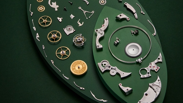《Escale en Amazonie》懷錶,是 LV 製錶史上最繁複的作品之一,內部搭載的 LFT AU14.03 手動上鍊機芯,多達555個零件,含有7個動態元素的自動人偶裝置、三問報時與飛行陀飛輪,連指針都藏在背面,只為讓錶盤上的「自然舞台」更淋漓盡致。工匠以鏡面拋光、倒角打磨、雕花處理、微繪琺瑯與金屬嵌飾琺瑯等技術層層構築;琺瑯顏色甚至堆疊多達五層以上,連葉脈都能精準呈現;鸚鵡羽毛、蛇鱗和猴子表情,每一筆都是工匠耐心與細心的同步。這不只是手工藝,更是微觀級的魔法演出。