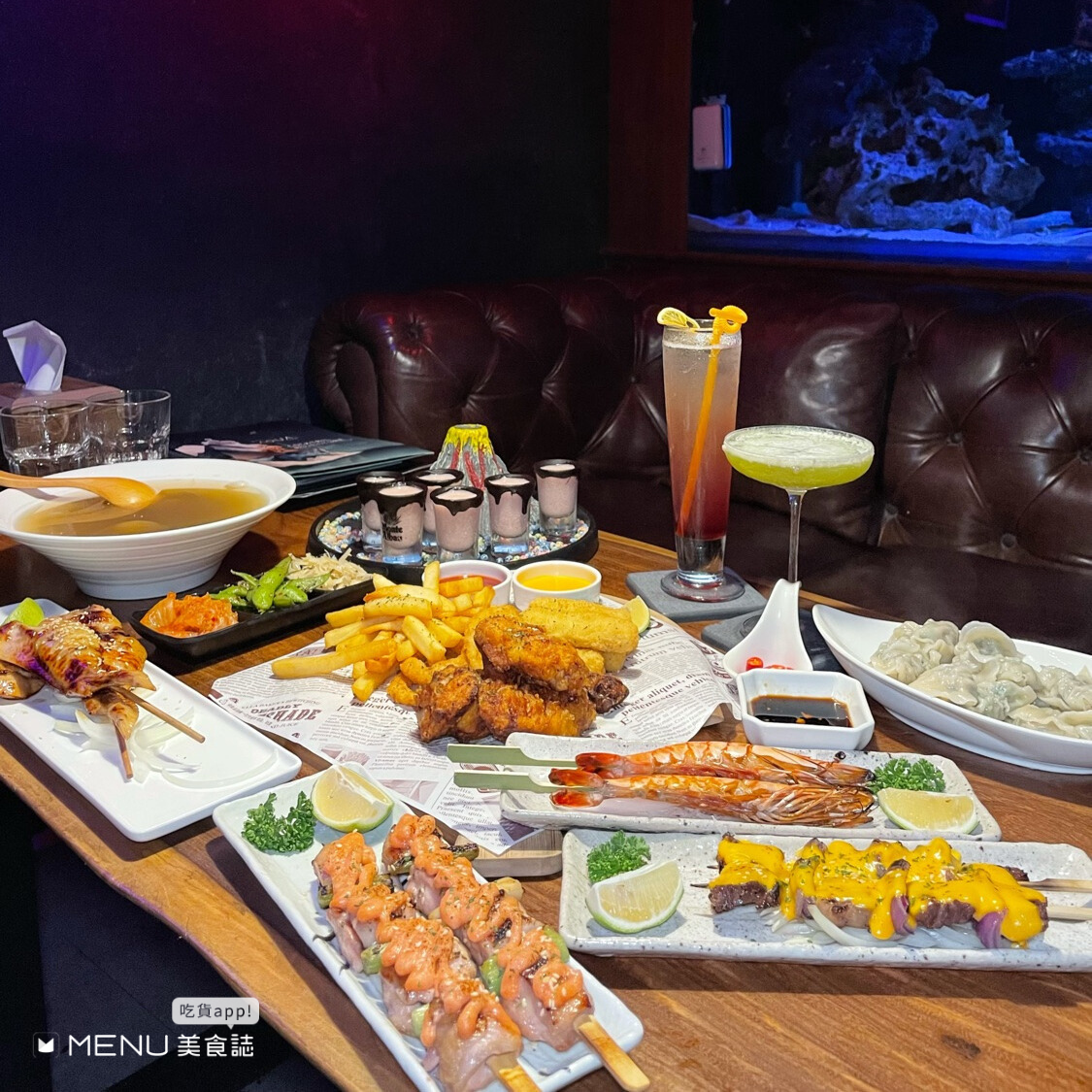 台北東區唯一海洋系餐酒館, 擁有兩大海水缸欣賞各種小魚悠遊。整體裝潢復古有質感,有吧台座及寬敞舒適沙發座!店內還有提供飛鏢機可以玩,餐點上主要以下酒串燒炸物為主,各個份量都很夠,酒類選擇多樣,另外特色調酒是海洋主題的,海洋概念呈現結合專業調酒師調配,超級驚艷啦,現在平日還有調酒活動!這間整體很可以氛圍超Chill 推薦給你。