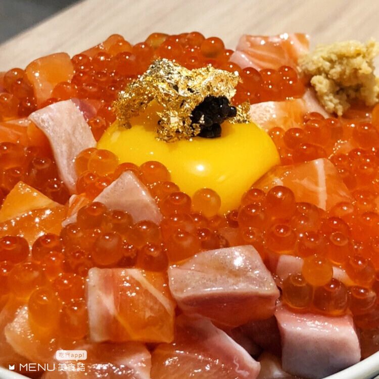 這間位在東區居酒屋一級戰區市民大道上,價格走的是小資族也可以吃起來的親民路線。必點限量金箔月見爆量鮭魚親子丼,整碗鋪上滿滿鮮甜鮭魚,以及口感嗶嗶啵啵鮭魚卵們 中間再鋪上月見蛋黃,用筷子輕輕劃開蛋黃液整個散發開來,整體起來更有層次且不膩口,最後上方灑上浮誇食用金箔及魚子醬作點綴。