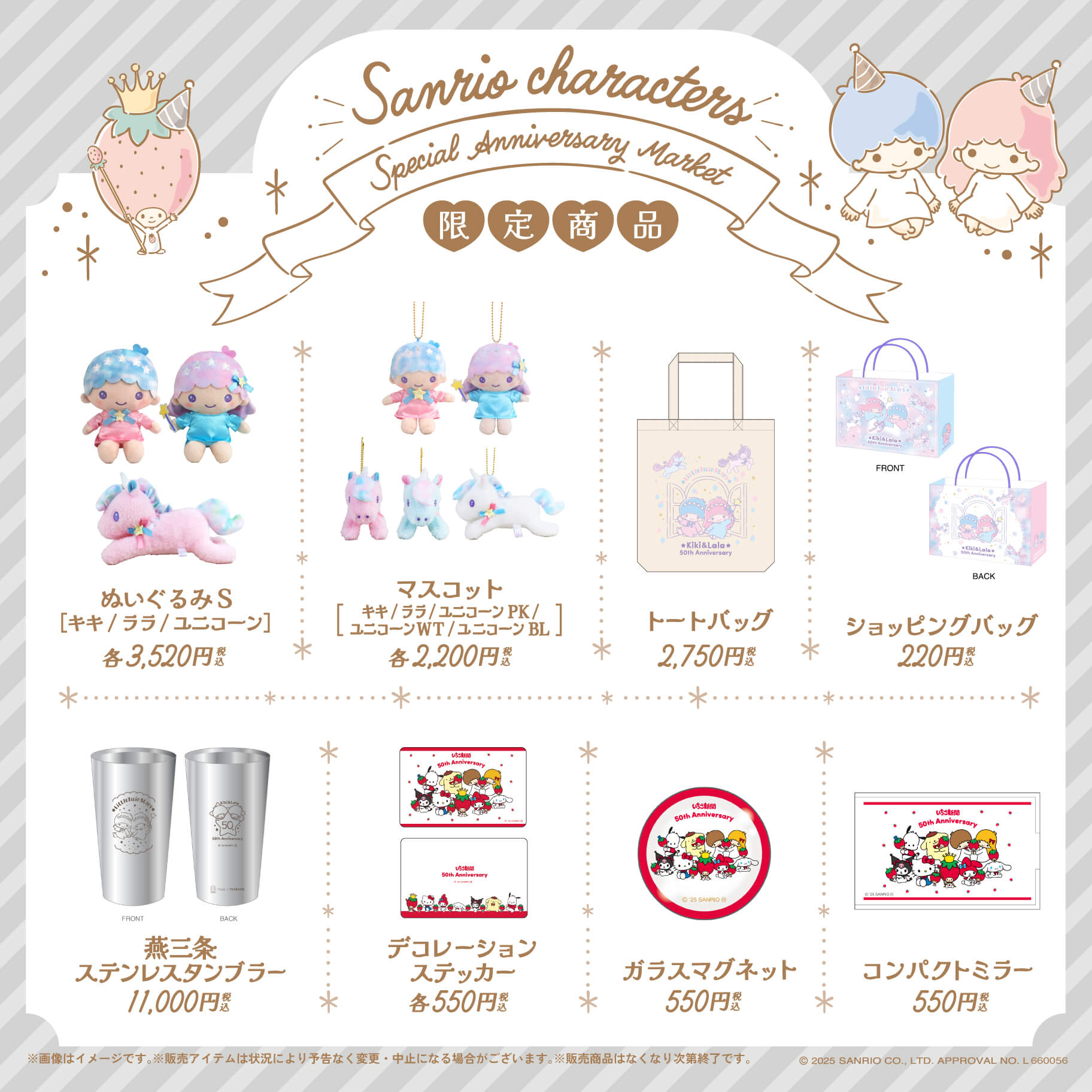 2025年是三麗鷗旗下多位人氣角色的重要週年慶典──《草莓新聞(いちご新聞)》迎來創刊50週年,美樂蒂(マイメロディ)與雙子星(リトルツインスターズ)也將共同慶祝50週年,人魚漢頓(ハンギョドン)40週年,庫洛米(クロミ)20週年,而男子偶像團體HAPIDANBUI(はぴだんぶい)則迎來成軍5週年。為了慶祝這個宛如奇蹟般的紀念之年,三麗鷗特別推出超大型購物活動「Sanrio characters Special Anniversary Market」!