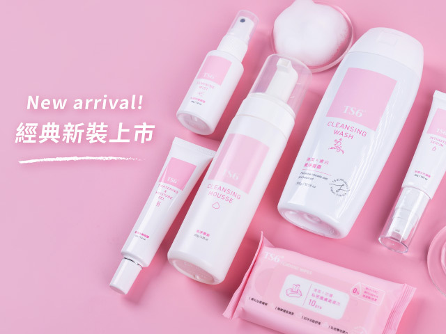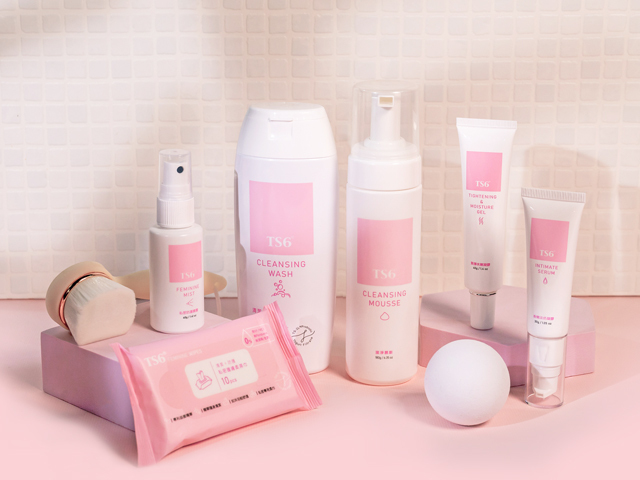 新裝上市的「TS6經典基礎系列」,包含潔淨慕斯、潔淨凝露、緊彈水嫩凝膠、粉嫩淡色凝膠、私密護膚柔濕巾跟幸福粉霧