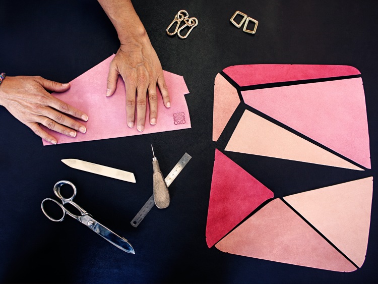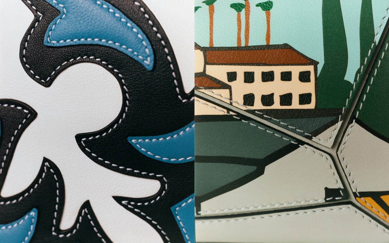 而有別於其它品牌以繪畫的形式呈現,Loewe 在圖樣的呈現上,是以「皮革鑲嵌」的技法製成,工匠必須先在皮面上鑿出圖樣的凹槽,並且運用另一塊皮革切割,並將其做組合,近乎摸不出接縫的製作做工法,將 Loewe 高超的製革技法展現其中。