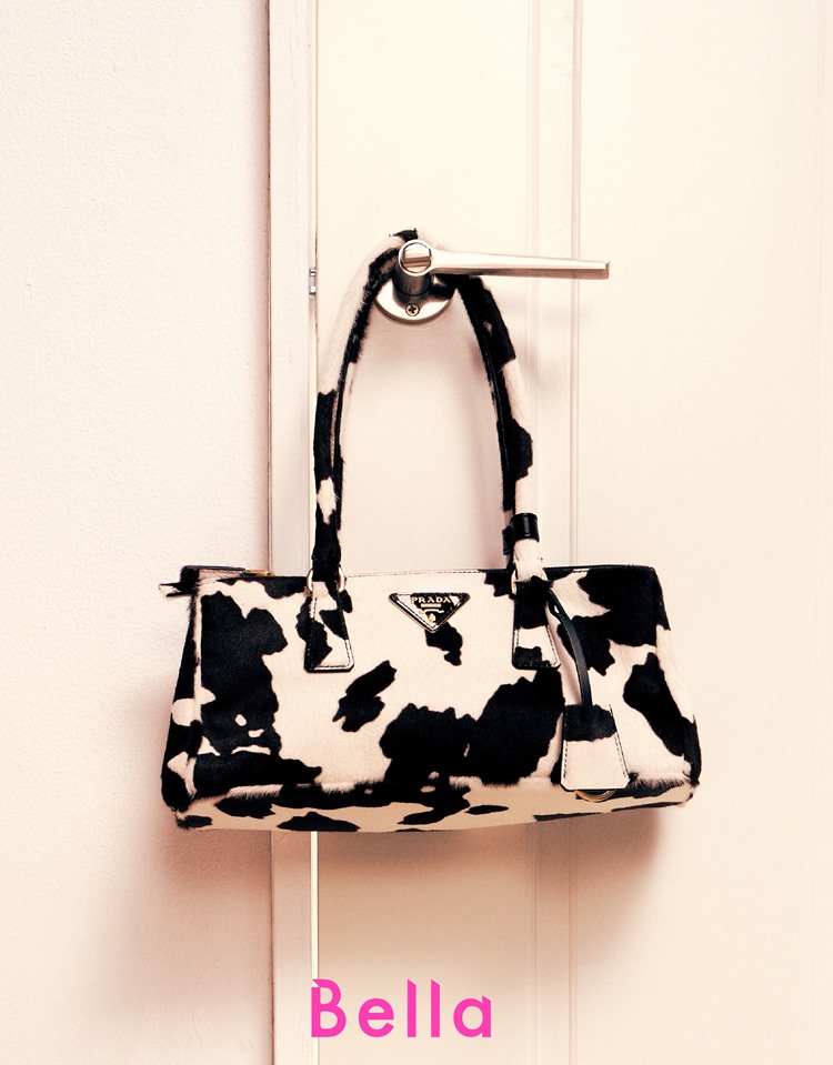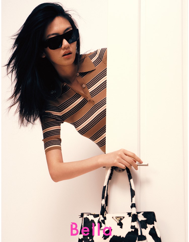 由中性色堆疊出來的條紋針織Polo衫及高腰短褲,合身版型加上領片,於休閒風格中帶入一點正式感,再點綴上同色系鈕扣,讓整體造型不單調;與造型搭配的Galleria印花皮革肩背包,以品牌標誌性皮革製成,加上大膽趣味的乳牛印花,修長提把兼具實用性與造型性,出門前再配戴上粗框墨鏡,輕鬆演繹Prada女孩的自信態度。