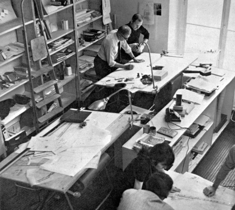 Prouve and associates Jacques Bédier, Reiko Hayama and Serge Binotto in his nitecture studio, Rue des Blancs-Manteaux, Paris, ca. 1970. © Centre Pompidou -AM/CCI-Bibliotheque Kandinsky-Dist. RMN-Grand Palais.