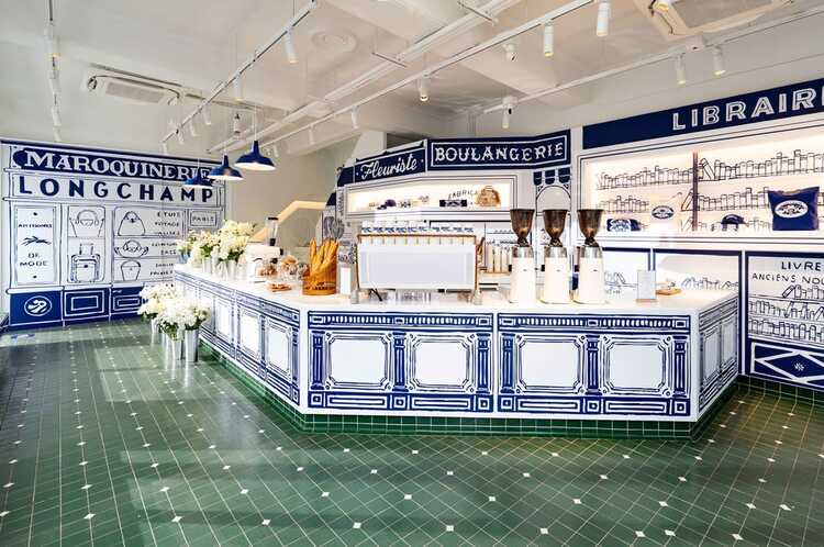 為了這次的聯名膠囊系列,Longchamp 也在最有詩意的 %Arabica 中山店打造了「 瓏 驤·匠 心 巴 黎 」 限 時 快 閃 街 區,從老書店的靜謐氛圍,到現磨咖啡的濃厚香氣,那 些 屬 於 巴 黎 匠人 的 日 常 片 段,都在 Constantin Riant 細膩的筆觸下夢幻呈現,整體空間以藍白為主軸,讓大家在炎熱的夏天感受到一絲沁涼,戶外座位區搭配溫暖的陽光,更將大家帶往巴黎街角的咖啡館。