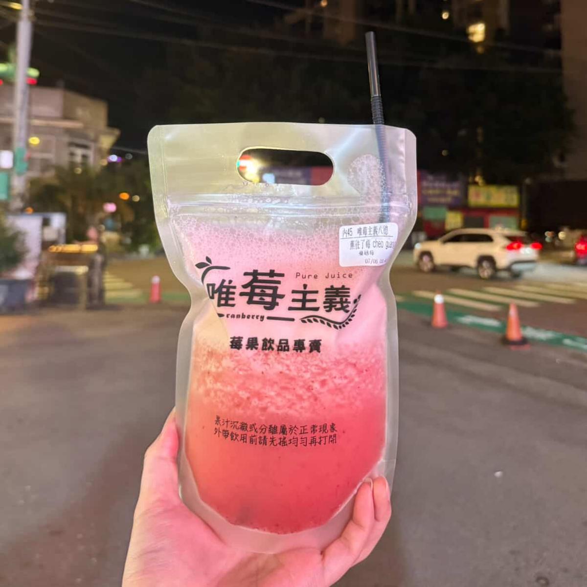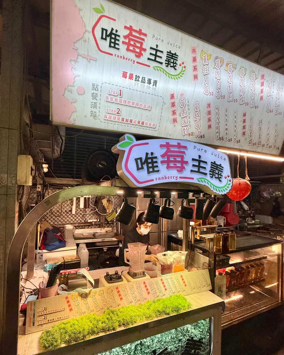 都到了夜市怎麼可能不來一杯現打果汁!這家「唯莓主義」以進口蔓越莓或草莓打底,並可自由選擇搭配搭配藍莓、香蕉、鳳梨、百香果等新鮮水果,再加入牛奶或可爾必思飲品,打造出清爽又健康的飲品,每一口都喝得到新鮮的果香,不只搭配鹹食或甜食都適合,也是款男女老少都能輕易愛上的健康飲品。
