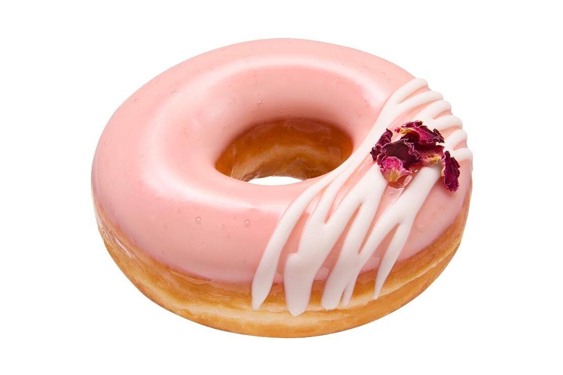 最後要推薦的是這款創意十足的「水蜜桃烏龍茶」甜甜圈,靈感來自於近年來備受歡迎的水果茶飲!以白巧克力包裹的甜甜圈為基底,表面塗上帶有水蜜桃烏龍茶清香甜味的糖漿。為了營造優雅的視覺效果,使用白巧克力繪製出精緻的線條圖案,並點綴上玫瑰花瓣,呈現出粉嫩華麗的外觀。