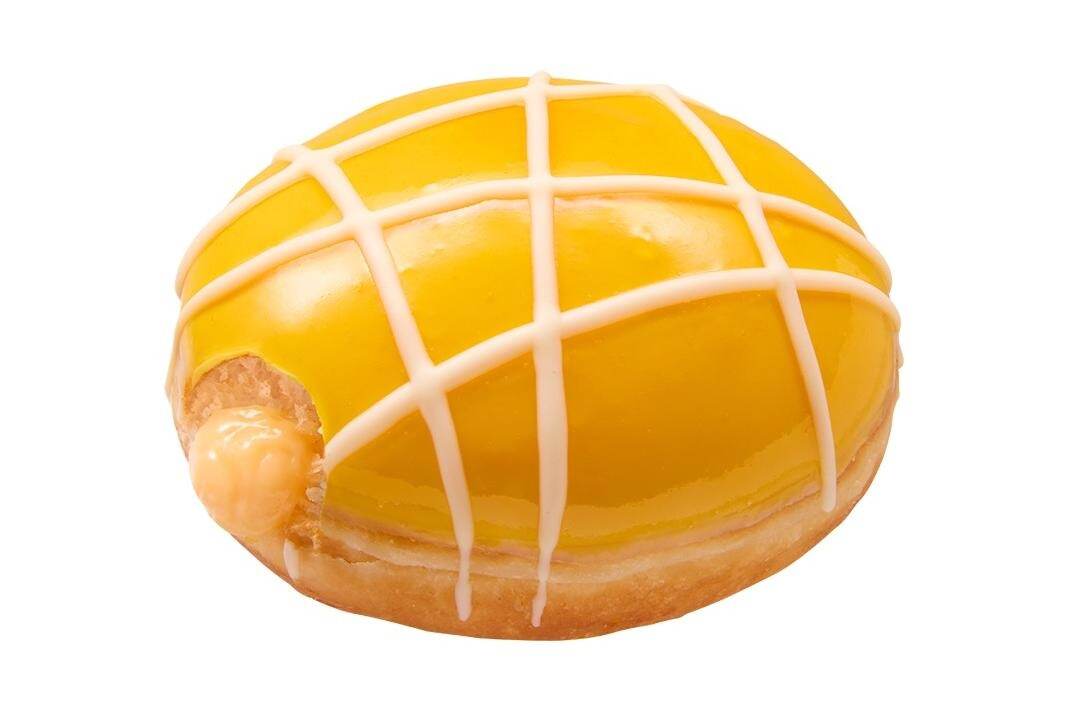 接下來是這款「芒果起司蛋糕」甜甜圈,將南國風情的芒果與濃郁起司完美結合!甜甜圈內部填入滿滿的芒果起司蛋糕風味奶霜,表面覆蓋著鮮豔黃色的卡士達風味巧克力塗層。特別的是,外層還使用芒果果泥製作的光澤糖漿,並用白巧克力繪製出精緻的線條,模擬芒果果肉的切塊造型。