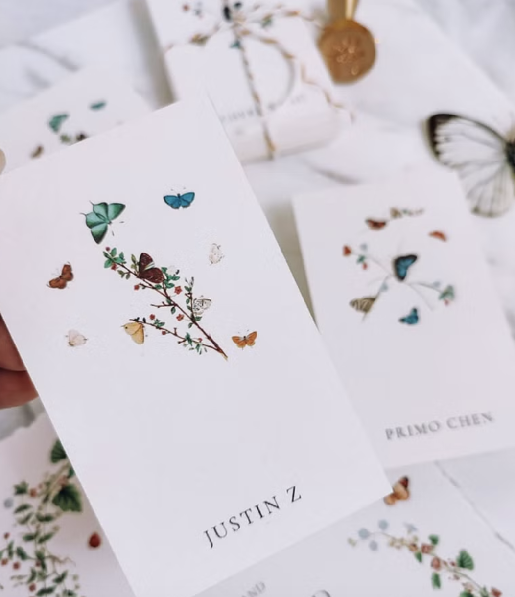 座位卡雖小,卻是展現婚禮美感與細緻度的關鍵。從顏色、字體、材質到排版,都可以融入婚禮主題風格。紙卡可搭配金屬名牌夾、木製小座架,或直接插於桌花中,成為裝飾一部分。此外,若賓客人數較多,也可設計一張主視覺風格的座位引導圖,張貼於入口處。統一的桌卡設計,不僅美觀,還能提升動線流暢度,是絕不能忽略的細節。