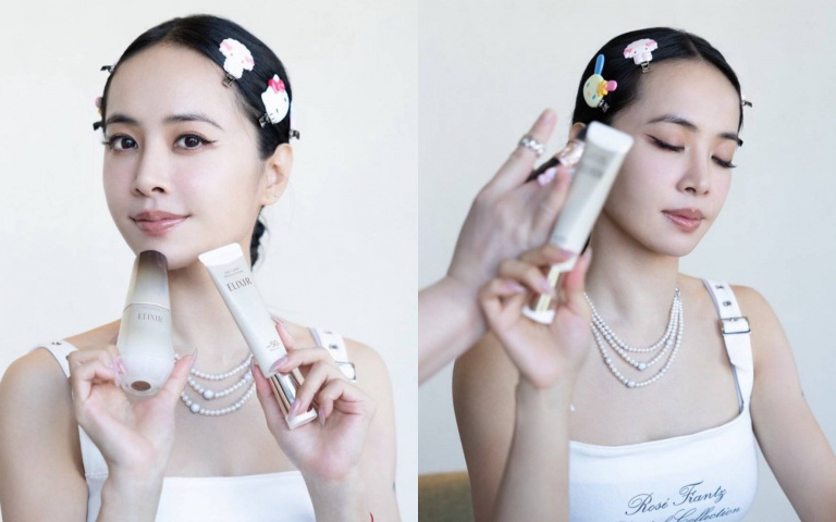 除了髮飾成亮點,她手上的ELIXIR怡麗絲爾膠原彈潤多效美肌乳與膠原新肌光速精華,也同步受到關注!從保養手勢到光澤膚況,彷彿每一幀都是保養教科書,不少粉絲留言:「她根本是保養界的最佳代言人!」、「44歲還能有這膚況太犯規了」。