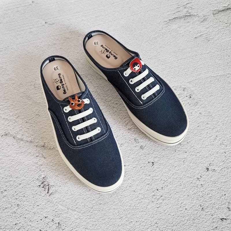 這雙的設計真的很可愛,童趣的「小紅帽與大野狼」配上牛仔藍鞋身超吸睛,更棒的是前包後空的半拖設計,不只好穿脫,也比一般拖鞋更穩,穿去逛街或上班都不突兀。