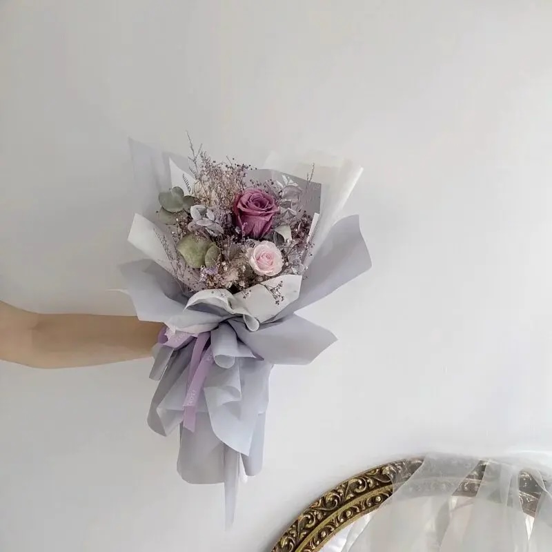 這款乾燥花束份量感很足,主花為蔚藍紫色系的永生玫瑰,搭配迷你滿天星與繡球,色系沉穩柔美,不會過於粉嫩。整束花束尺寸剛好適合手拿,儀式結束後也能當居家擺設,保留婚禮的溫度。搭配韓系風格婚禮更是毫無違和感,低調卻有記憶點。