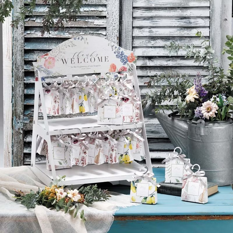 這款衣架造型的餅乾套組有種日雜感的精緻小巧,還可以客製新人姓名和結婚日期。一盒內有五入餅乾,甜而不膩、外型討喜,搭配紙製展示台整體非常有誠意。這類型的婚禮小物特別適合用在送客或二進禮上,拍照好看、也方便分送,讓賓客在離開會場時還能多一份驚喜。