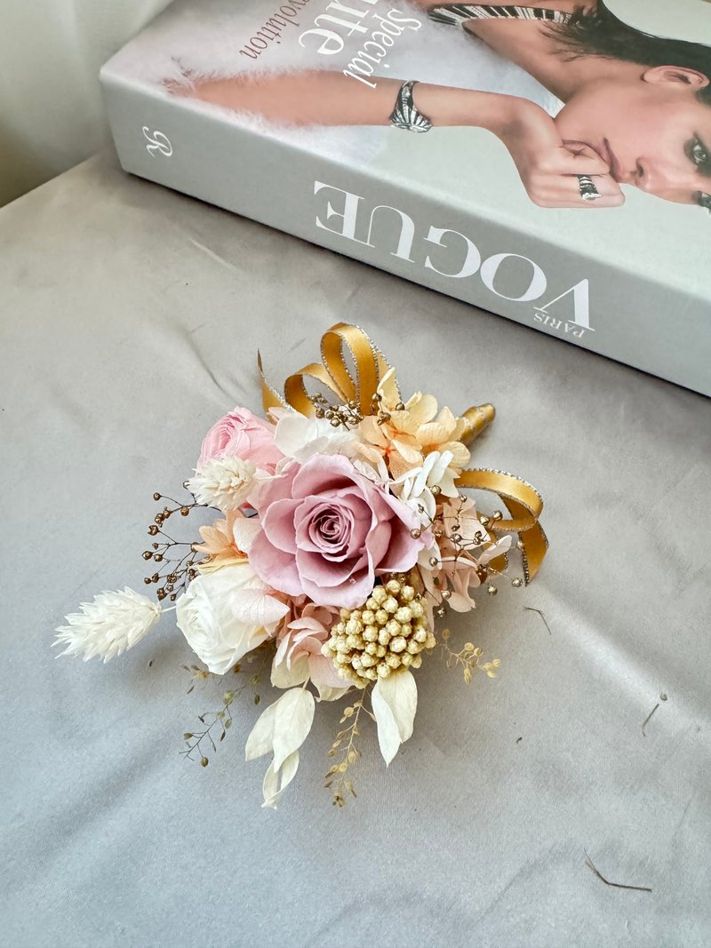 如果想讓婚禮造型更完整,永生花胸花會是一個很加分的小細節。這款胸花使用乾燥花與永生花混搭製作,每一朵都由手工製成,成品獨一無二。雖然尺寸不大,但戴在胸前非常有質感,結束後也可以當紀念品保存。
