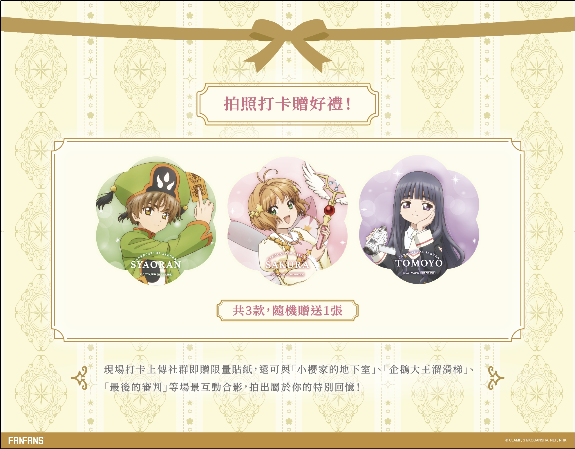 快閃店完整還原《庫洛魔法使》中的名場面,包括「小櫻家的地下室」、動畫中的「企鵝大王公園」、以及「最後的審判」壯麗場景。現場同步設置角色的1:1立牌,夢幻粉櫻背景更是拍照必留景點,打造沉浸式氛圍。