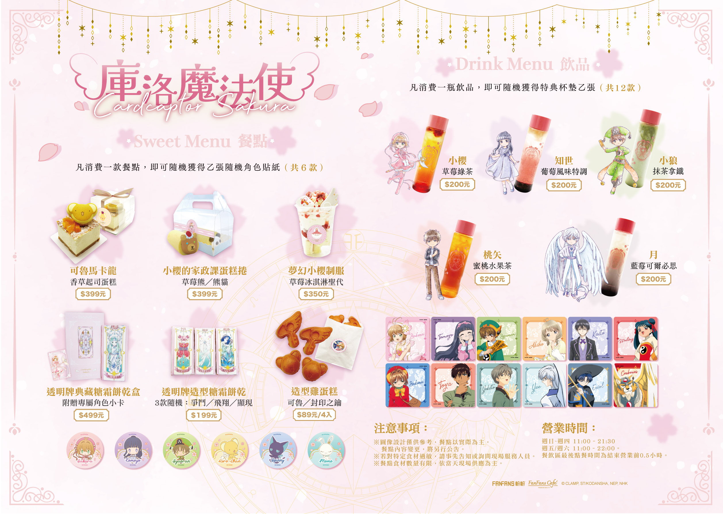 快閃店同步推出限定主題甜點,包括小櫻的家政課蛋糕捲(兩款,草莓熊/熊貓),療癒外型搭配綿密蛋糕體,還原小櫻家政課時所出現的蛋糕捲模樣。還有透明牌造型糖霜餅乾(隨機三款,爭鬥/飛翔/顯現),經典卡牌造型甜點,香脆可口,兼具視覺與味覺雙重享受。凡購買甜點,即可獲得隨機Q版角色貼紙乙張(隨機贈送,恕不挑款),數量有限,請把握機會。