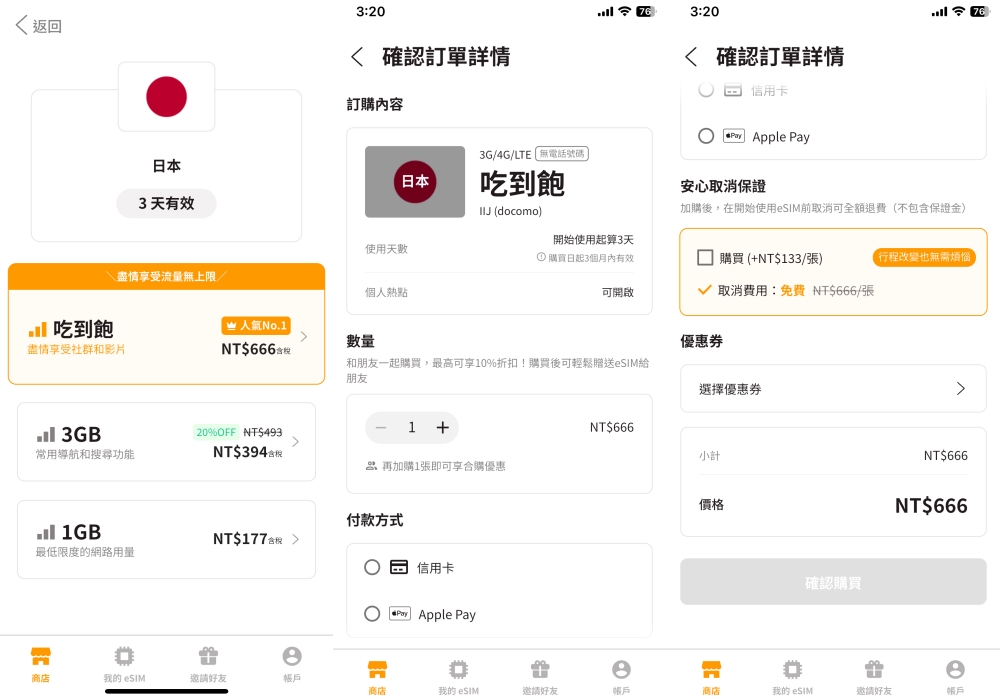 下一個步驟就是選擇方案,有流量型也有吃到飽方案可供選擇。最後,就會來到確認訂單的畫面。 付款方式可以選擇信用卡或是Apple Pay,記得在選擇優惠券的欄位中輸入Japaholic 獨家優惠碼「JH2025」,可享有10%折扣。另外,若擔心行程會有所變動,也可以加購「安心取消保證」。