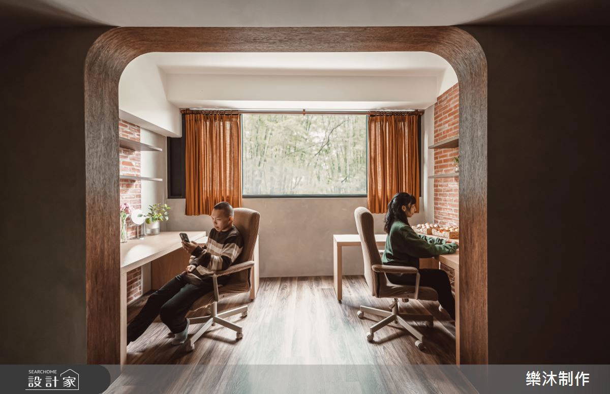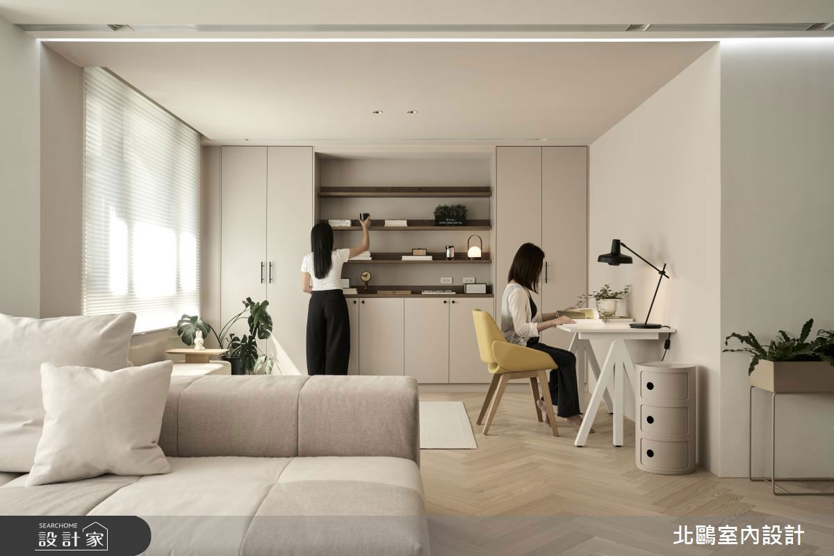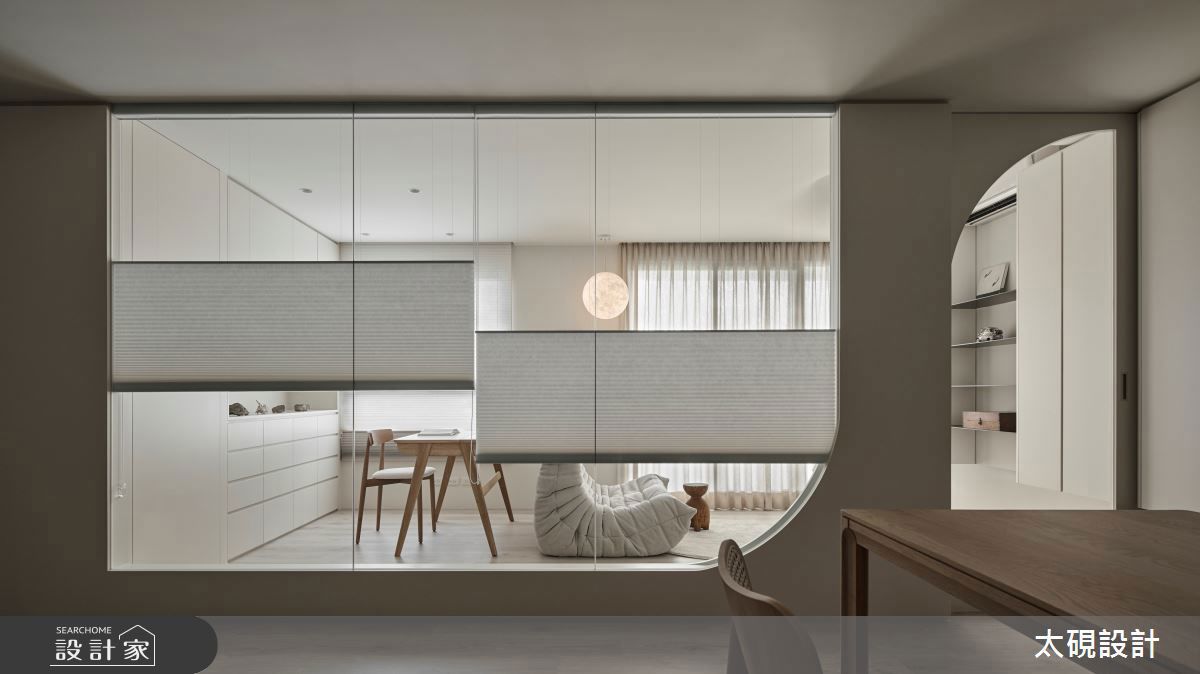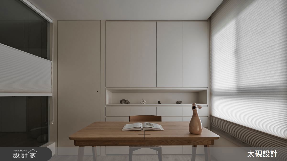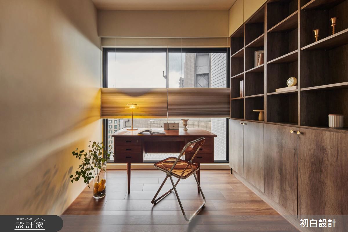24坪的私宅透過巧妙的空間佈局,理順整體動線,而書房則成為串聯公私領域之間的過渡節點。設計師巧思地將臥室入口隱藏於半開放式書房中,不僅劃出明確的機能層次,也為寢臥空間築起一層柔性緩衝。為保留單面採光優勢,同時兼顧隱私性,書房隔牆選用清玻璃材質拼接,搭配風琴簾作為可調節的視線屏障,光線與隱私得以兼容。內部則沿兩側立面設置收納櫃體,透過色彩的協調運用,使空間瀰漫溫潤且無壓的閱讀氛圍。家具配置上,以淺色木質書桌搭配造型簡約的設計單椅,不僅保留靈活運用的彈性,也讓閱讀時光多了一分愜意與從容。
