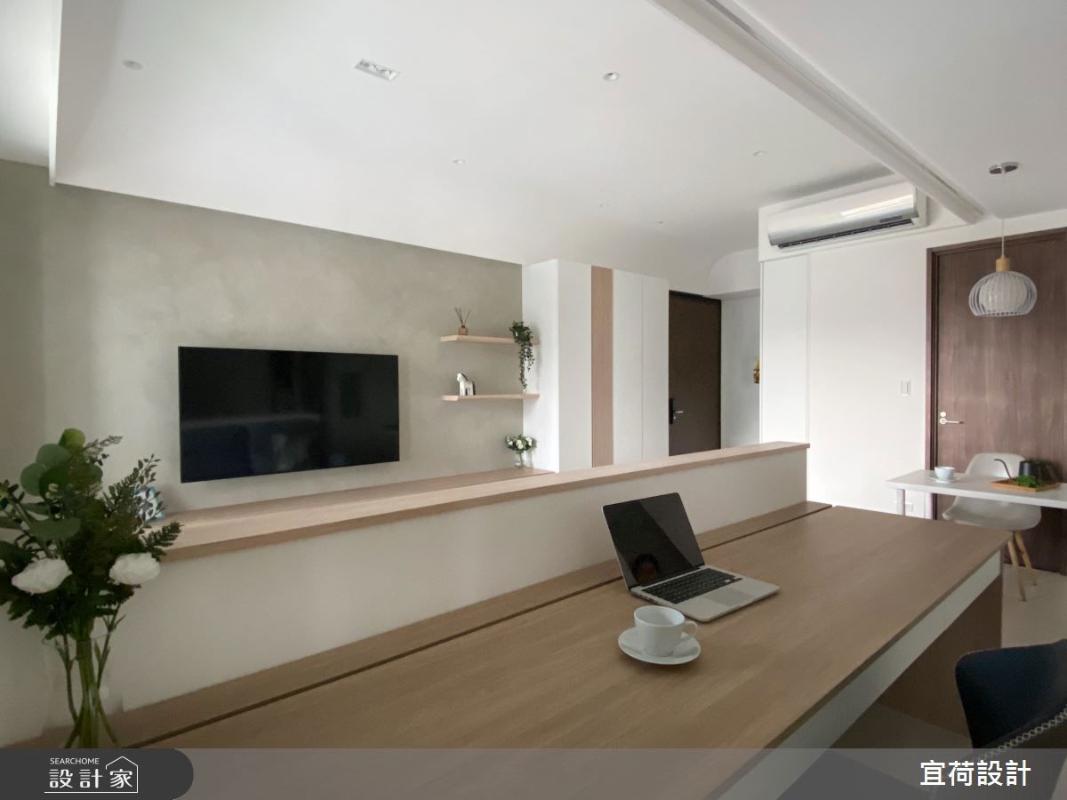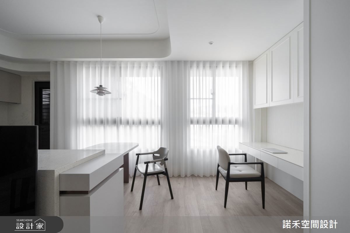 僅12坪的空間採用複合式概念整合客、餐、廚與書房,讓小空間坪效最大化。書房設於窗邊,以純白書桌與收納櫃搭配美式線條,營造出明亮舒適的工作角落。面朝牆面設計有助提升專注力,窗景與日光相伴,增添愜意氛圍。整體與客廳、餐廚區採複合式開放格局,透過電視牆結合中島與餐桌,使空間機能整合又具彈性。不僅保有功能分區的明確感,也兼顧互動與生活便利,讓小宅也能擁有專業又溫馨的學習與工作環境。