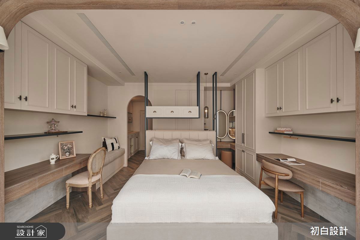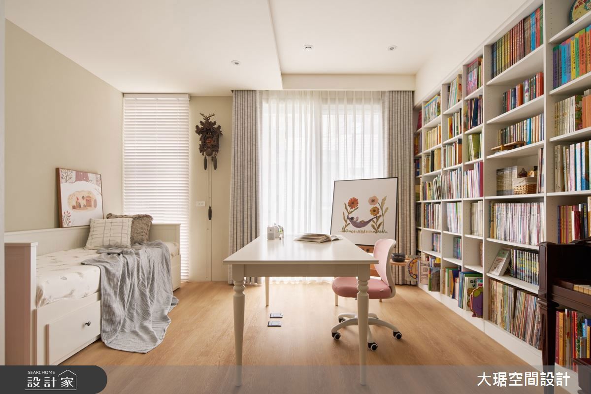 本案採用半開放式書房設計,巧妙利用天花大樑劃分出書房區域,再以半高牆結合清玻璃隔間,界定場域同時保有通透感。從客廳望去,只能看見書房內人的頭部,視線不會落到桌面,有效維持整體視覺的清爽與空間整潔感。書房內部則順應樑下空間整合收納,櫃體依照精準比例劃分,展現出井然有序的秩序美感。上層可收納夫妻藏書,下層則貼心規劃為童書區,方便孩子取用,提升親子共用的實用性與互動性。窗邊加設臥榻,成為親子閱讀或日常小憩的靜謐角落,讓書房不只是功能空間,也是一處充滿溫度的生活場景。