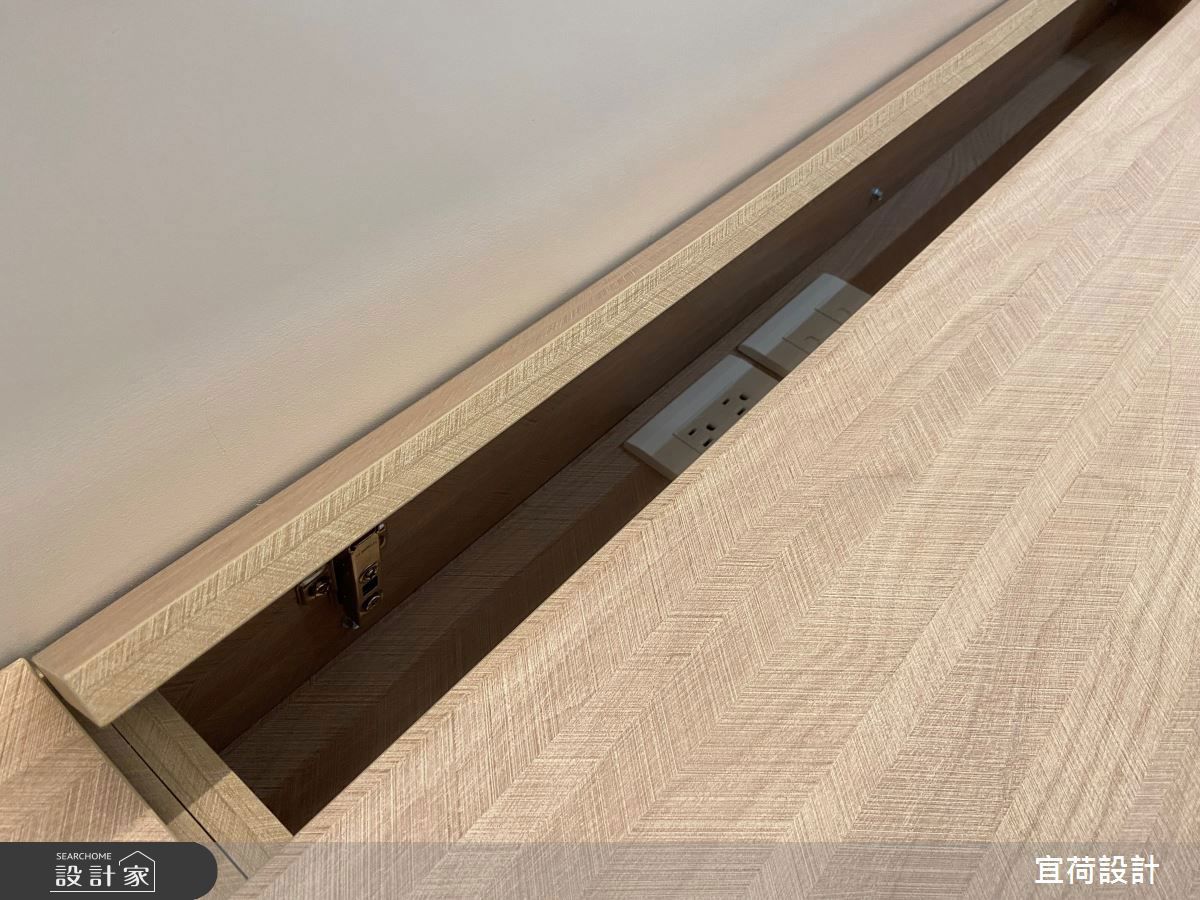 30坪的中古屋藉由靈活設計,巧妙整合書房與多功能區,讓辦公、閱讀、音樂演奏等多元生活機能共融於一室,空間依舊保持開放與通透。量身打造的大尺寸書桌朝向電視牆,設置線孔槽與具散熱功能的主機架,側邊整合多組電源插座,大幅提升操作各式3C設備的便利性。周邊收納櫃皆採門片式設計,內部精細規劃文具隔層與分類儲位,讓物品井然有序、取用方便,不僅大幅提升收納效率,也使整體視覺更清爽一致。此區域在功能與美感之間取得平衡,成為兼具專注與放鬆的理想生活場域。