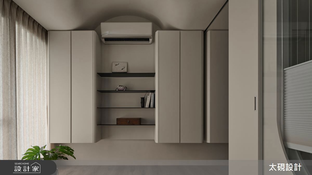 在僅有20坪、且為單面採光的住宅中,若要納入書房設計,維持通透感便成為關鍵。設計師巧妙將書房安排於採光最充足的區域,並以木框玻璃推拉門作為隔間,不僅避免傳統開門造成走道壓縮的問題,也讓自然光線無論門開與否,都能流暢灑入室內,成為宛如端景般的優雅畫面。書房內部配置僅保留必備機能,療癒臥榻與系統板材訂製訂製書桌,兼具日常辦公、閱讀與休憩功能。即便空間有限,仍保有舒適的使用動線與視覺清爽的氛圍,展現小宅中書房設計的最佳平衡。