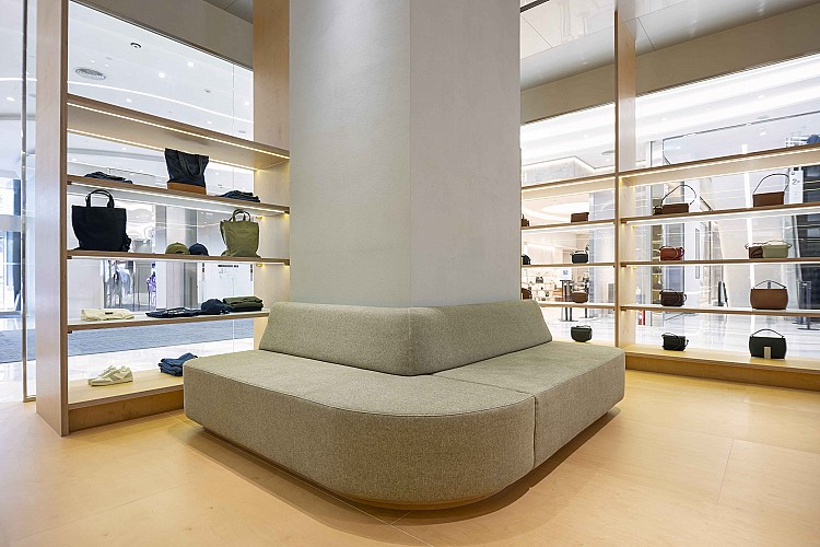 A.P.C. Dream Plaza形象店延續品牌對結構與比例的執著,由合作多年的法國建築事務所 Laurent Deroo Architecte 操刀設計,以「isometry 等距同構」為核心概念,透過等距投影構圖邏輯,將幾何學原理轉譯成實體空間,垂直與水平元素交織成一幅視覺網格,從牆面延伸至中島無一不精準切割,而在154 平方公尺的店鋪中,採用 Okoume 木紋合板、鋁合金蜂巢層架與高透鏡面玻璃,營造出理性、秩序與溫潤詩意並存的極簡場域,至於試衣間則隱身於幾何格構後方,透過錯位設計保有隱私感,同時呼應整體建築語彙,使每一步移動都像是在經歷一場設計與邏輯交融的探索。