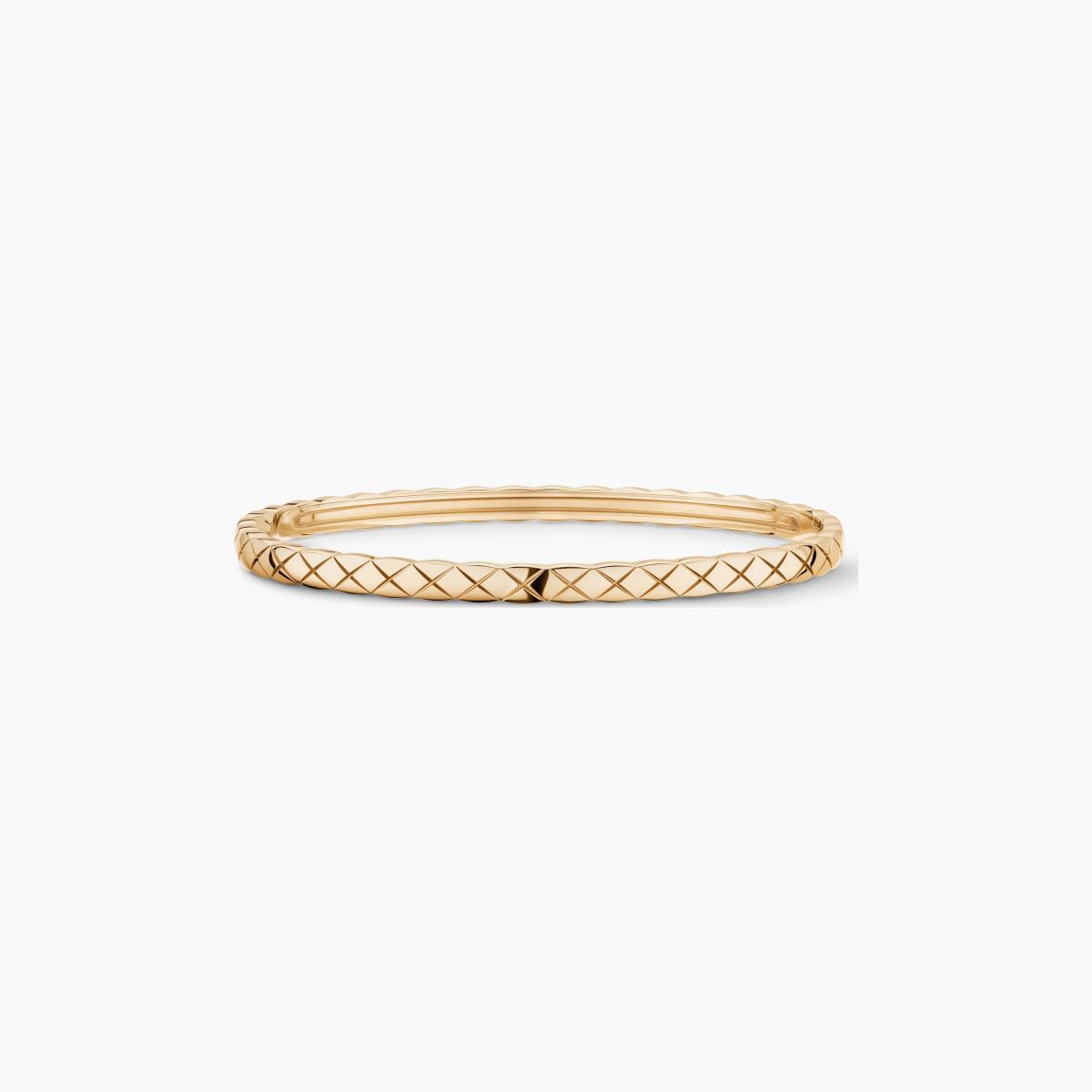 細窄的手環,像是腕間的一道金色筆劃,優雅卻有力量。18K Beige 米色金、黃K金與白K金三色可選,適合與不同寬度的 Coco Crush 手環疊戴,或與經典香奈兒腕錶混搭,讓金屬與菱格紋交織出多層次的風格。這是一款能從日常穿搭延伸到晚宴造型的萬能單品,簡單一圈,就勾勒出屬於你的專屬印記。(價格 NTD 176,000~188,000)